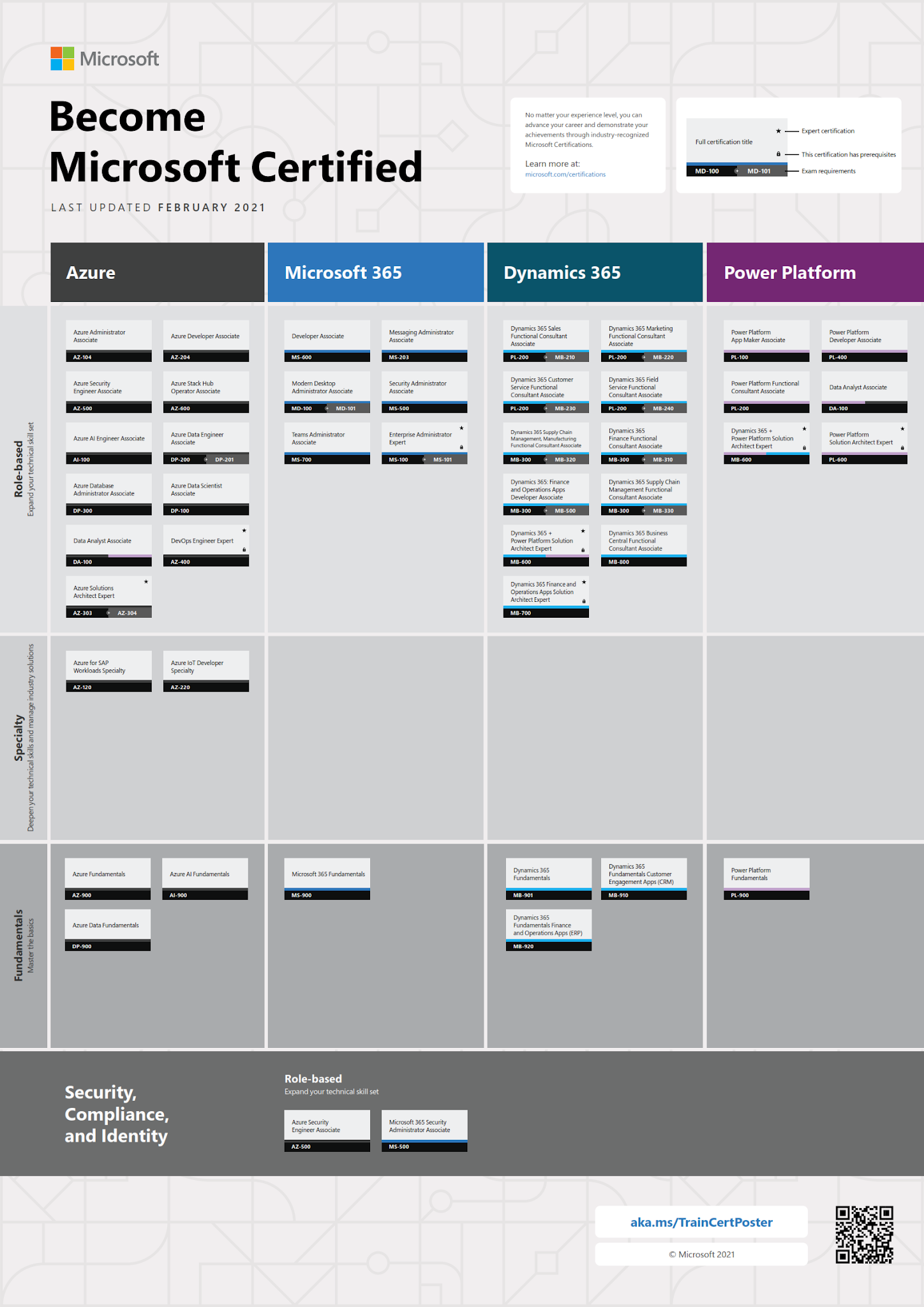 Check out our recently updated certification poster to see what technical certifications are available across Microsoft Azure, Microsoft 365, Dynamics 365, Power Platform, and Security. From fundamentals, role-based, to specialty certifications, share this with your learners to help them discover their certification journey.